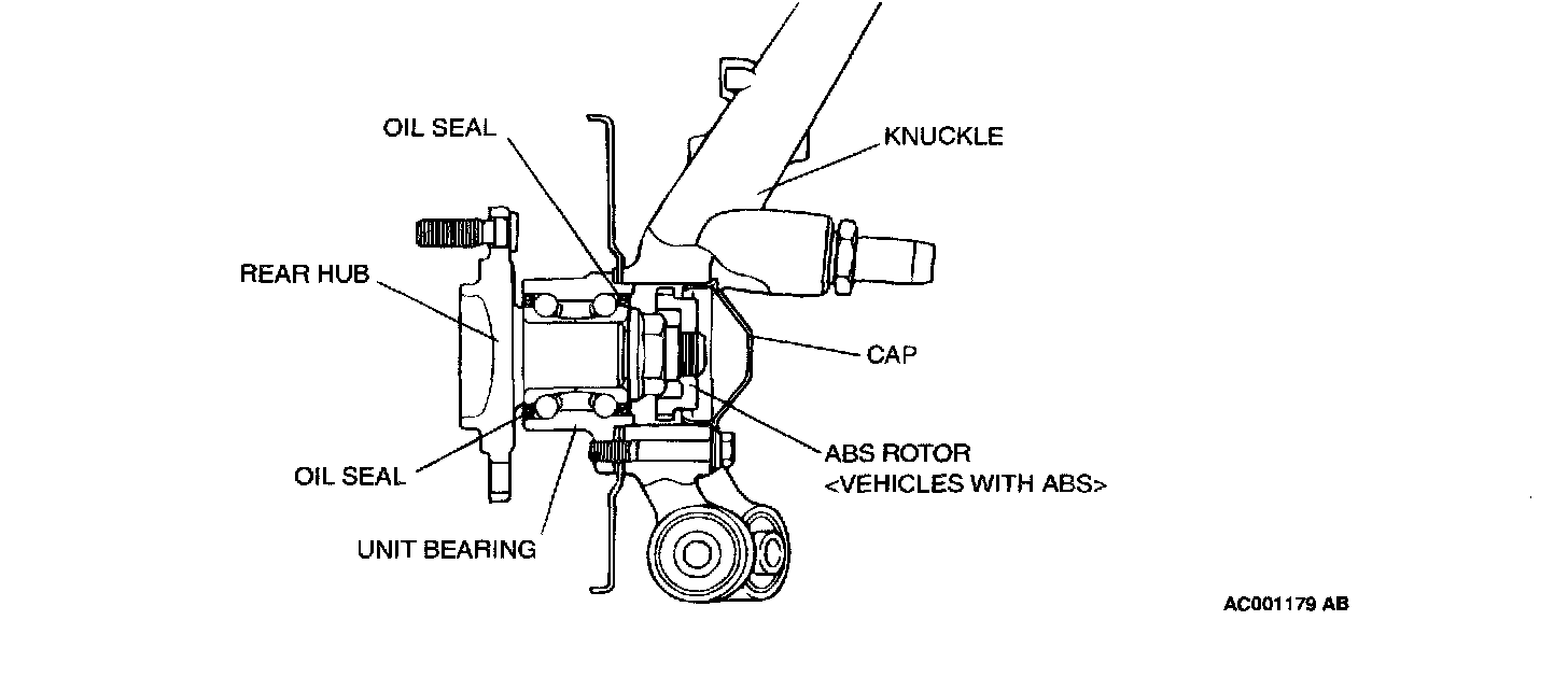 GENERAL DESCRIPTIONThe rear axle consists of a knuckle, rear hub, unit bearing. The unit bearing is press-fitted to the rear hub and bolted to the knuckle. Also, the unit bearing utilizes the same type of double row angular contact ball bearing as does the front axle.