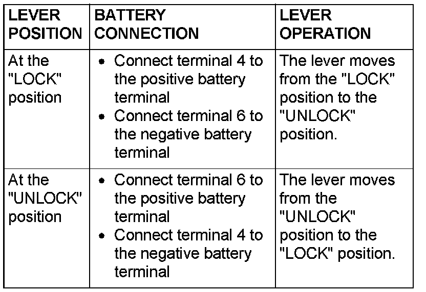 2. Follow the given table to check the driver's door lock actuator for correct operation.