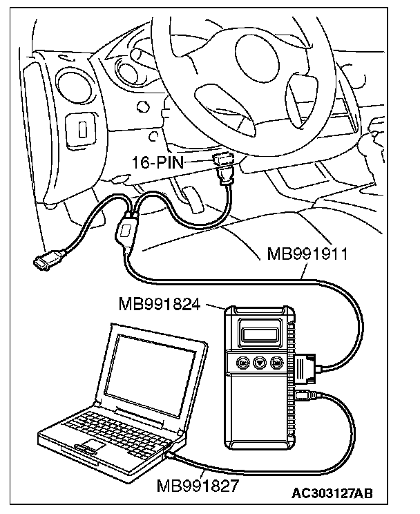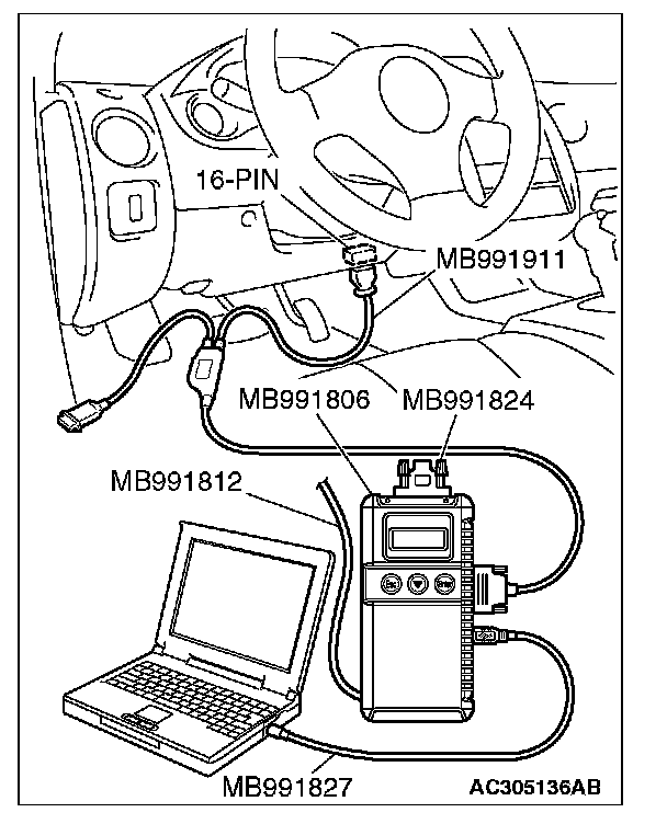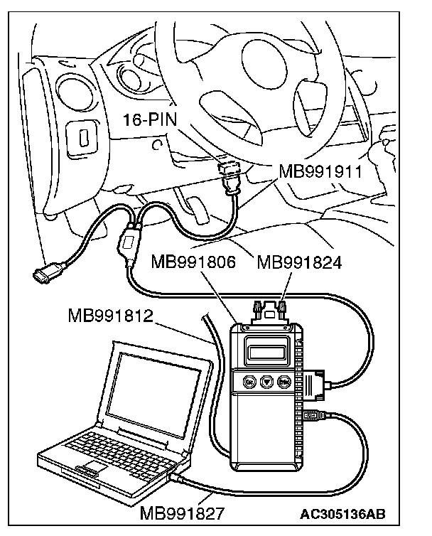 CAUTION: To prevent damage to scan tool MB991958, always turn the ignition switch to the "LOCK" (OFF) position before connecting or disconnecting scan tool MB991958. Connect special tool MB991911 before connecting special tool MB991812. Be sure to connect special tool MB991806 after turning on special tool MB991824.