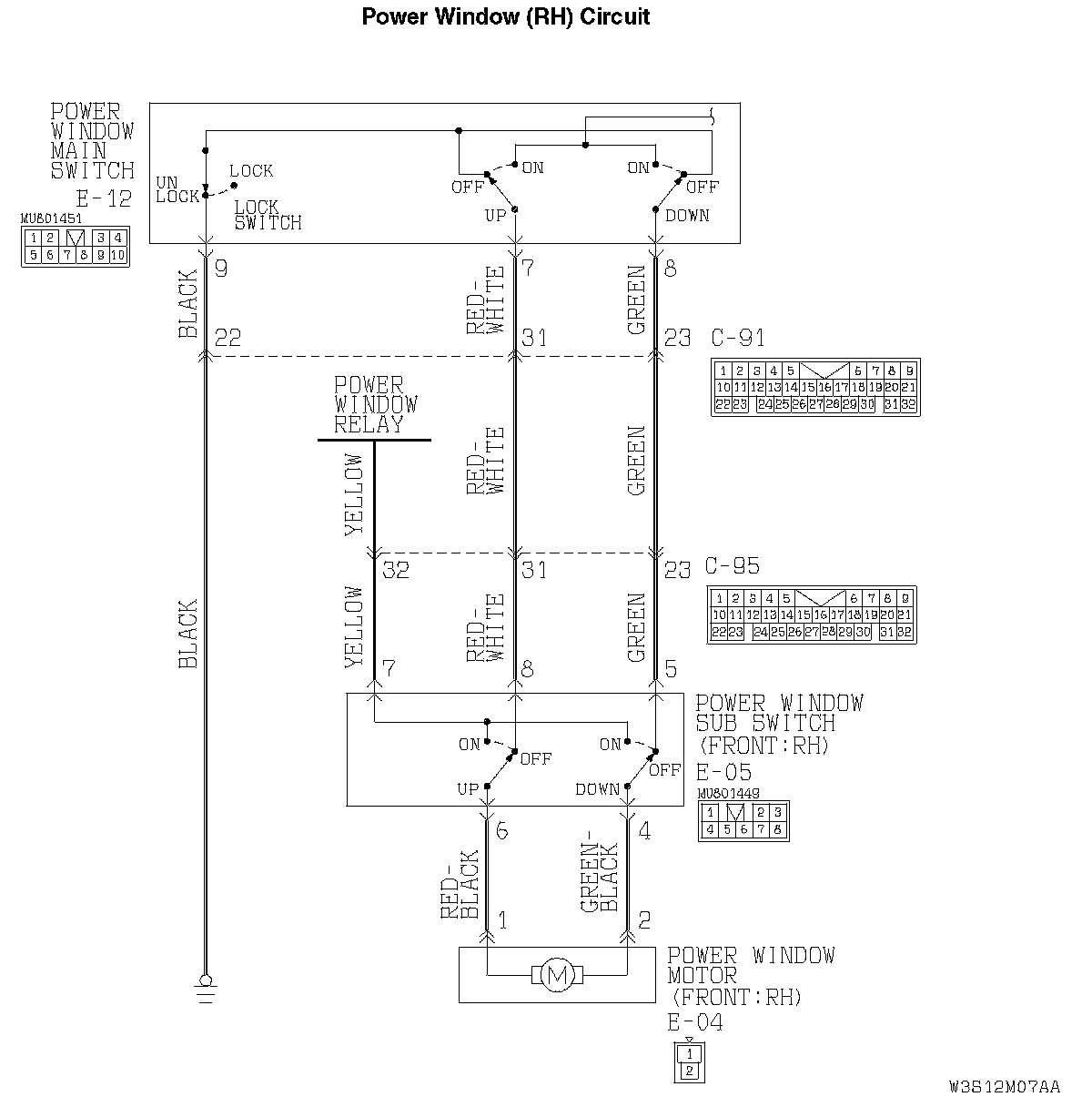 Power Window: Power Window (RH) does not Work by Operating Power Window Main Switch.Power Window (RH) Circuit: