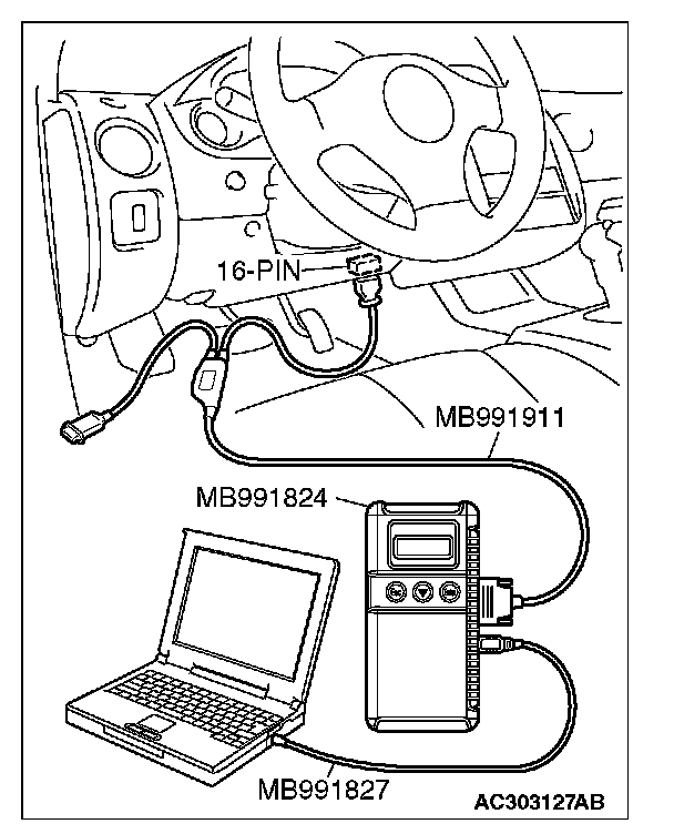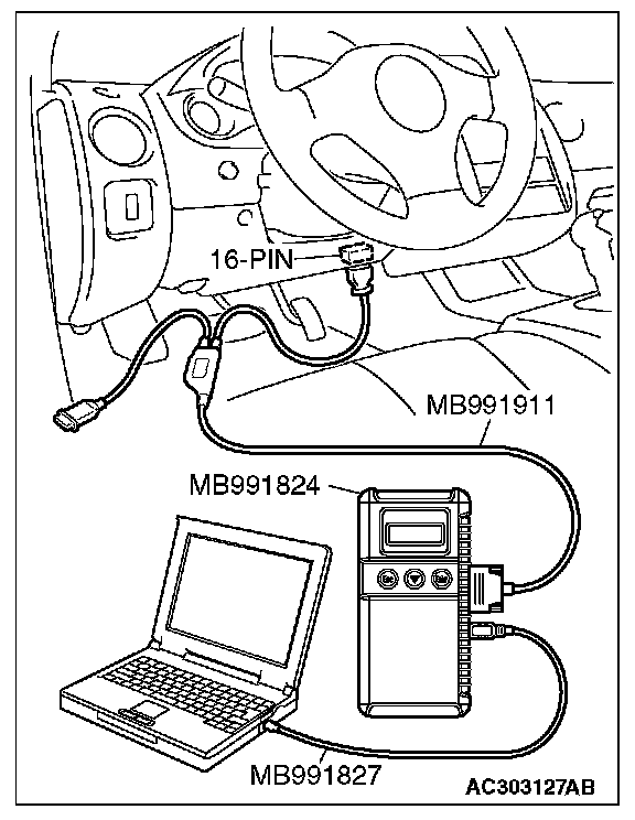 CAUTION: To prevent damage to scan tool MB991958, always turn the ignition switch to the "LOCK" (OFF) position before connecting or disconnecting scan tool MB991958. Connect special tool MB991911 before connecting special tool MB991812. Be sure to connect special tool MB991806 after turning on special tool MB991824.