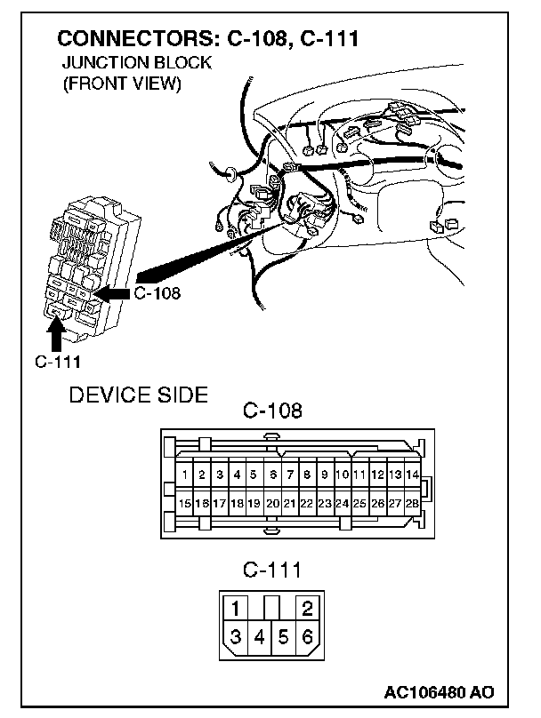 NOTE: Also check junction block connectors C-108 and C-111. If junction block connector C-108 or C-111 is damaged, repair or replace the connector as described in Harness Connector Inspection.
