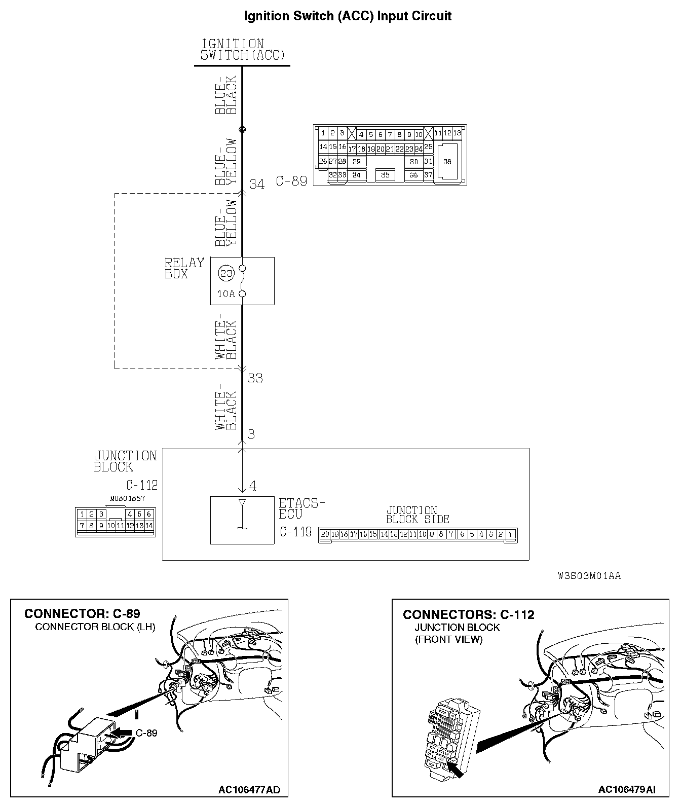 YES: Replace the ETACS-ECU. If the equipment, which are described in "CIRCUIT OPERATION", work normally, the input signal from the ignition switch (ACC) should be normal.