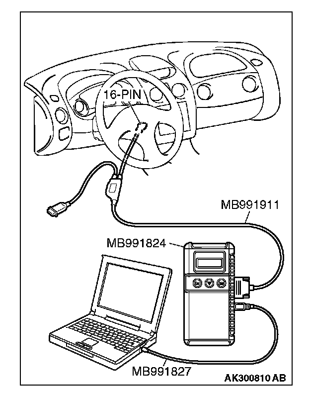 CAUTION: To prevent damage to scan tool MB991958, always turn the ignition switch to the "LOCK" (OFF) position before connecting or disconnecting scan tool MB991958.