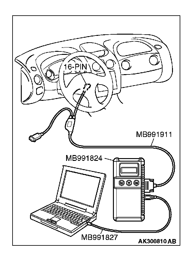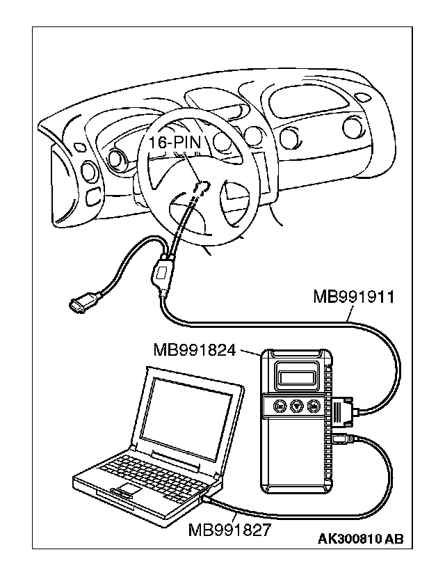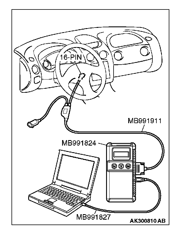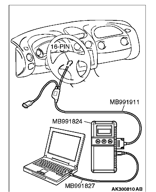 CAUTION: To prevent damage to scan tool MB991958, always turn the ignition switch to the "LOCK" (OFF) position before connecting or disconnecting scan tool MB991958.
