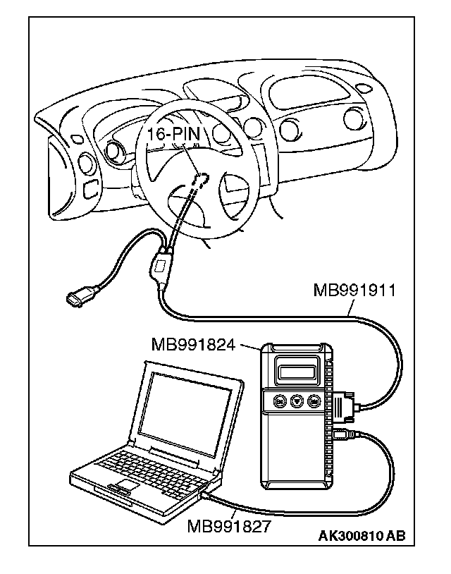 CAUTION: To prevent damage to scan tool MB991958, always turn the ignition switch to the "LOCK" (OFF) position before connecting or disconnecting scan tool MB991958.