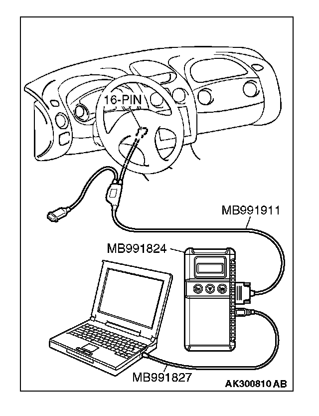 CAUTION: To prevent damage to scan tool MB991958, always turn the ignition switch to the "LOCK" (OFF) position before. connecting or disconnecting scan tool MB991958.