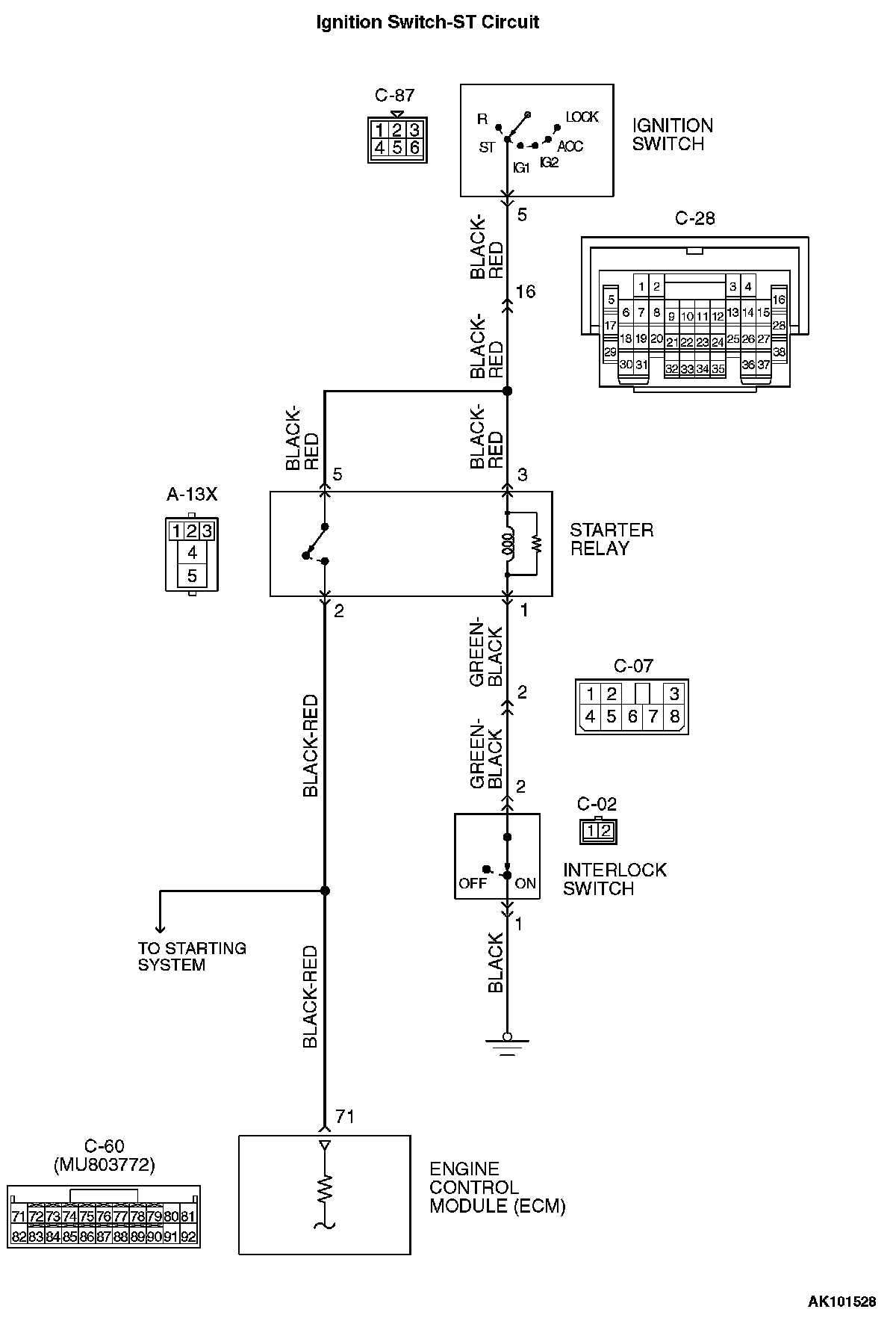 - The battery positive voltage is supplied to the ECM (terminal No. 71) via the starter relay during engine cranking. With this, the ECM detects that the engine is being cranked.