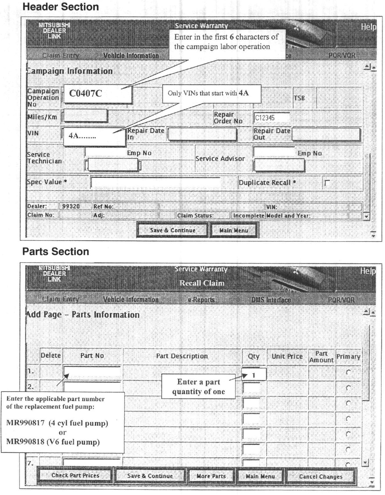 Claims for this campaign must be entered as Recall type "C" claims. Sample claim screens are shown.