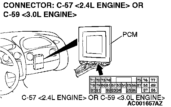 STEP 4. Check PCM connector C-57 <2.4L Engine> or C-59 <3.0L Engine> for loose, corroded or damaged terminals, or terminals pushed back in the connector.
