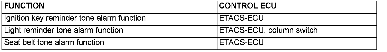 GENERAL DESCRIPTION CONCERNING TONE ALARMThe tone alarm functions are as shown. These functions are controlled by relevant ECUs.