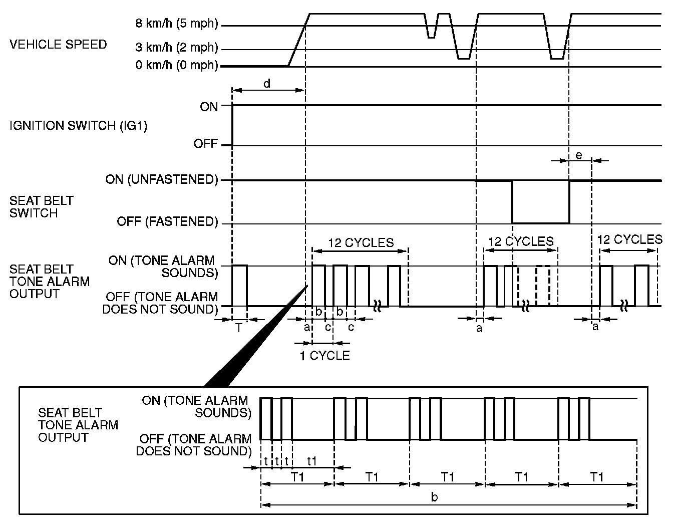 - Sounds the tone alarm 12 cycles (after 0.5 seconds) if any of the following conditions is met when sixty seconds or more have elapsed since the ignition switch is turned "ON". One cycle consists of five-second "on" and then three-second "off".