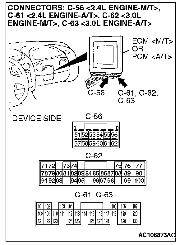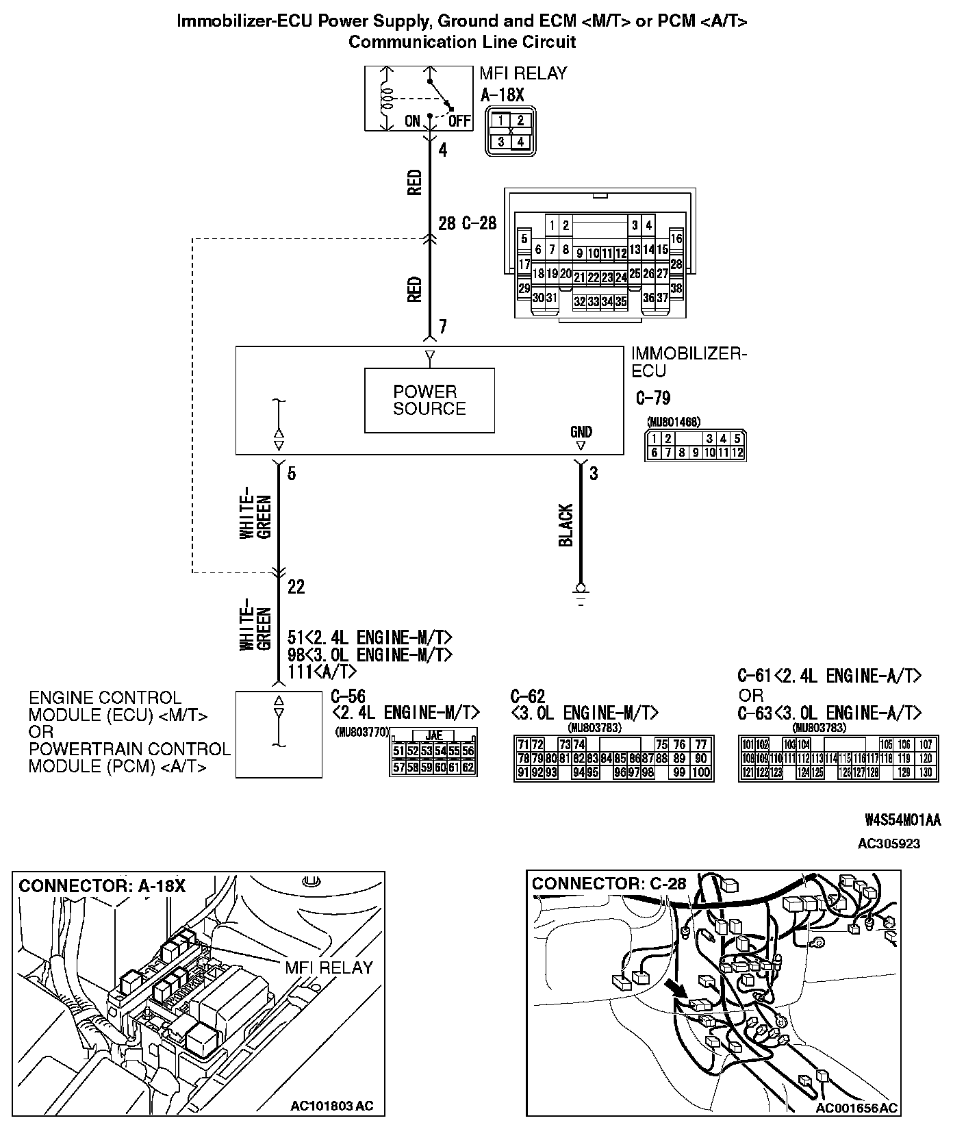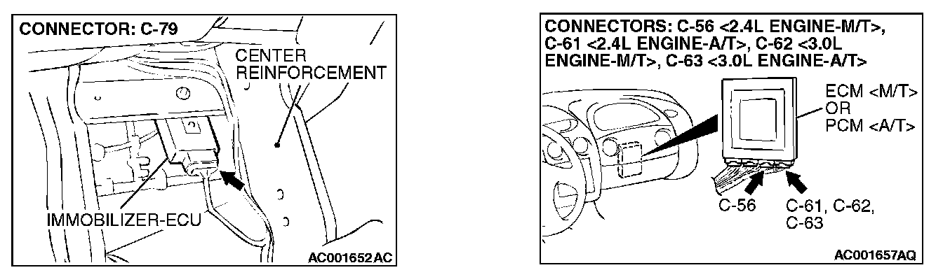 Q: Are the wiring harness between immobilizer-ECU connector C-79 and ECM connector C-56 (terminal 51) <2.4L M/T>, C-62 (terminal 98) <3.0L M/T> or PCM connector C-61 (terminal 111) <2.4L A/T>, C-63 (terminal 111) <3.0L A/T> damaged?