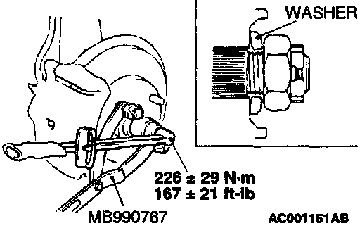 ^ Do not remove the nut from ball joint. Loosen it and use special tool MB991897 to avoid possible damage to ball joint threads.
