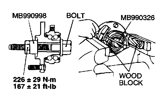 1. Install the special tools MB990998 and MB990326 to the front hub assembly and tighten the nut to the specified torque.