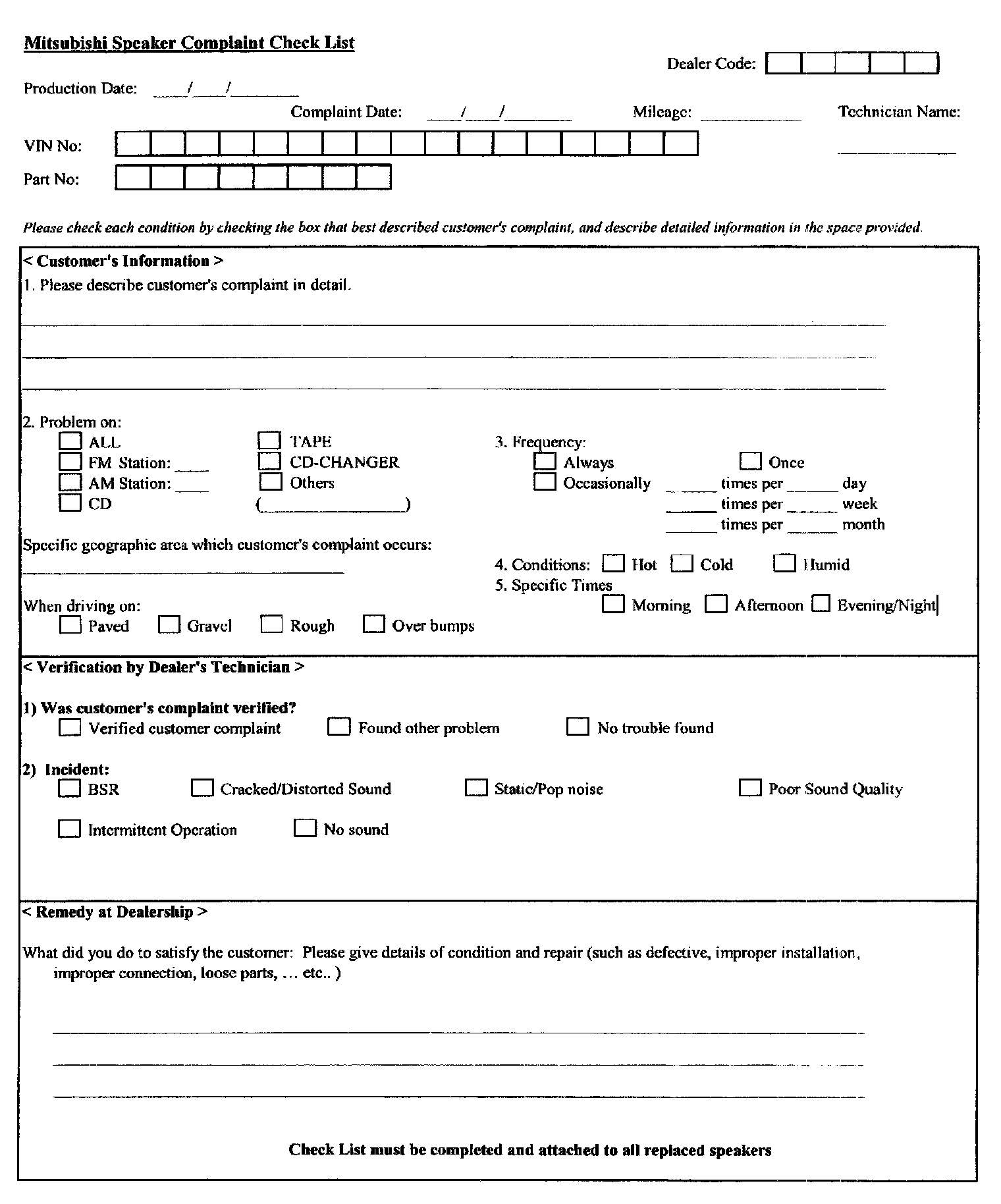 If warranty speaker replacement is required, the SPEAKER COMPLAINT CHECK LIST at the end of this bulletin MUST be completed and attached to the replaced speaker and held until the subsequent request for return is issued.
