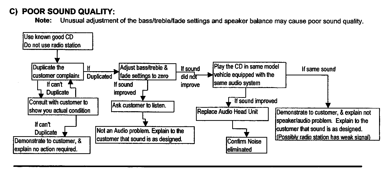 Proper diagnosis of speaker or speaker related conditions is important for customer satisfaction and correct warranty reporting. Some of these reported abnormal sounds, which are often attributed to the speakers, may have other origins. Speakers are often replaced without the actual problem being solved. In some cases, supposedly faulty speakers returned for warranty have been checked by the speaker manufacturer with no problem found. Make sure the suspected speaker is carefully evaluated before replacement. Use the troubleshooting procedures represented in the three flowcharts in this bulletin to help diagnosis speaker related conditions.