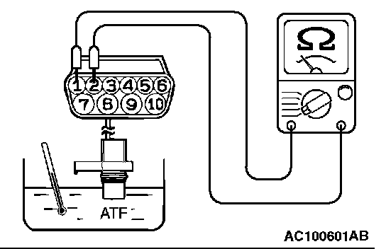 2. Measure the resistance between terminals 1 and 2 of the transmission fluid temperature sensor connector.