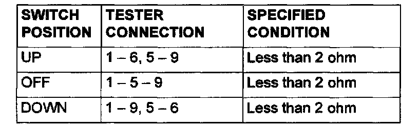 2. Check the continuity when the power window main switch is turned to the UP position or DOWN position.