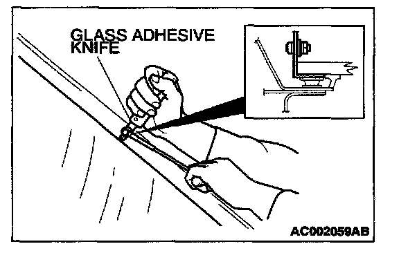 CAUTION: Putting glass adhesive knife too deeply into windshield adhesive may damage windshield.