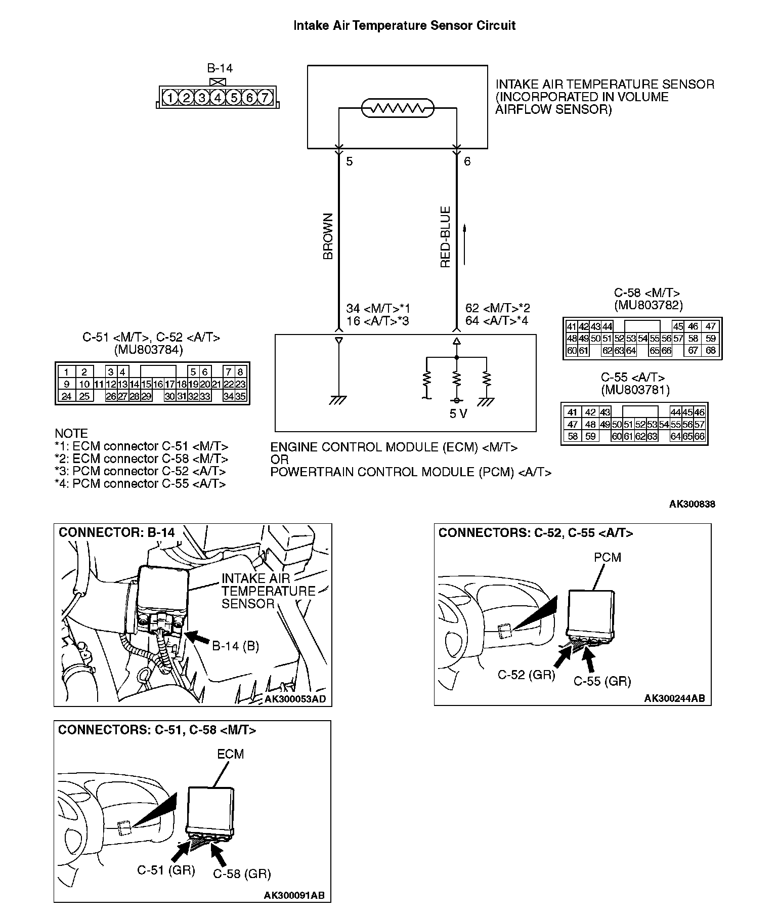 - Approximately 5 volts are applied to the intake air temperature sensor output terminal (terminal No. 6) from the ECM (terminal No. 62)