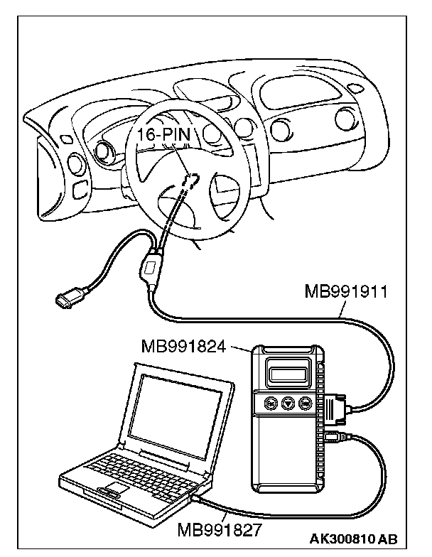 CAUTION: To prevent damage to scan tool MB991958, always turn the ignition switch to the "LOCK" (OFF) position before connecting or disconnecting scan tool or MB991958.
