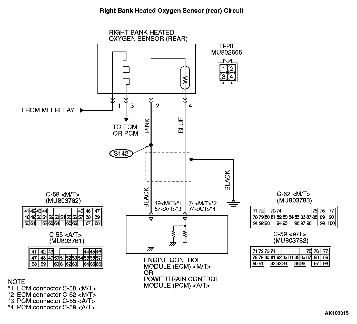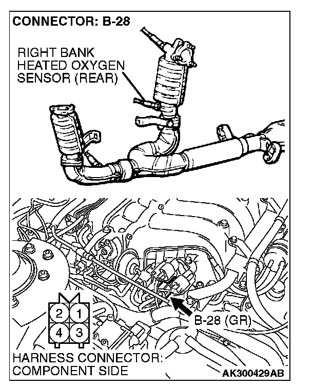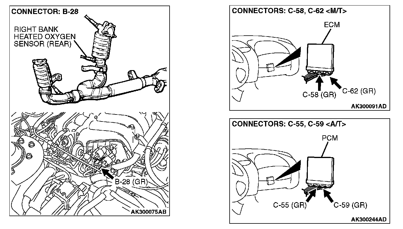 STEP 1. Check connector B-28 at right bank heated oxygen sensor (rear) and connector C-62 at ECM