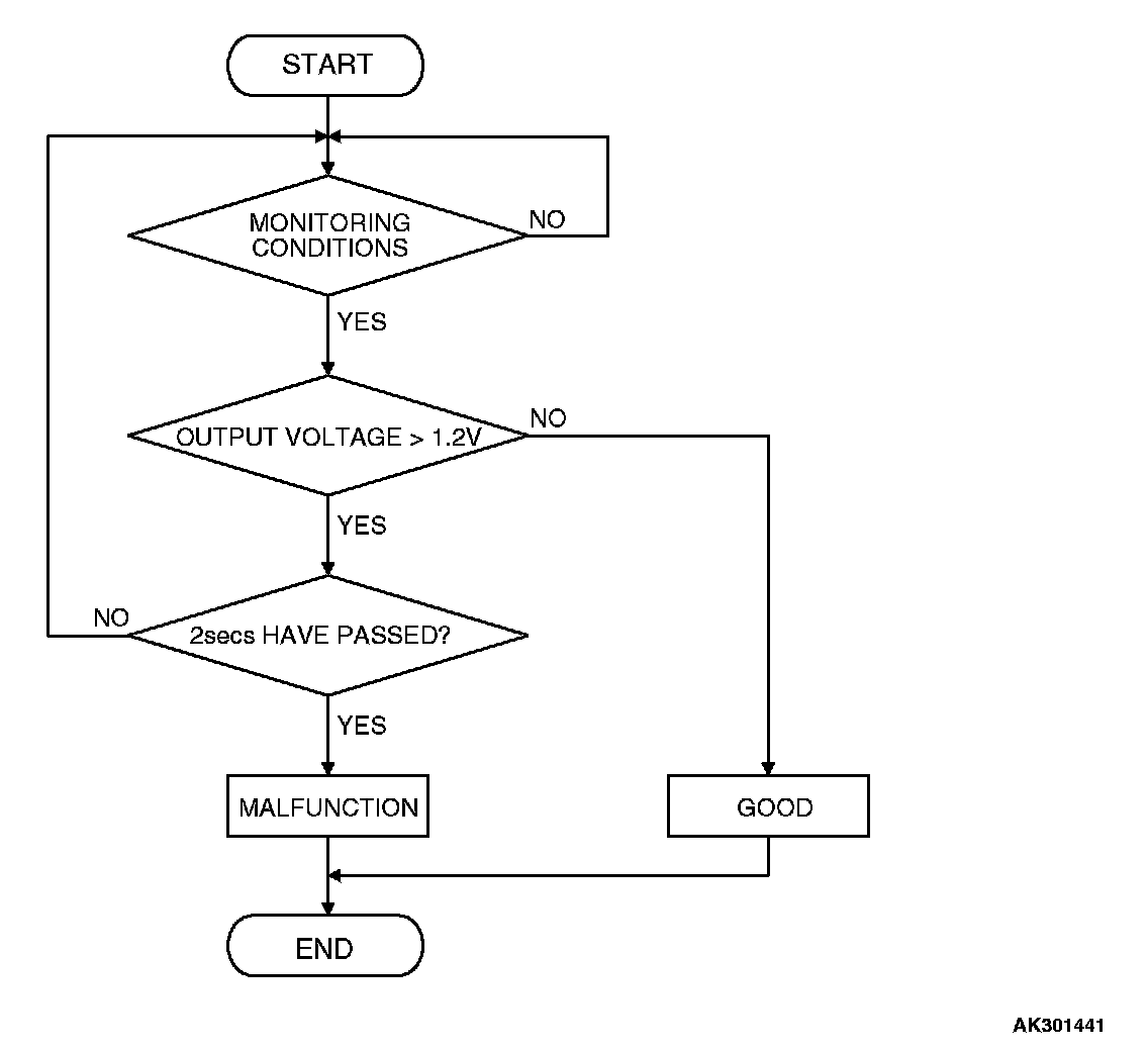 - Right bank heated oxygen sensor (rear) output voltage has continued to be 1.2 volts or higher for 2 seconds.