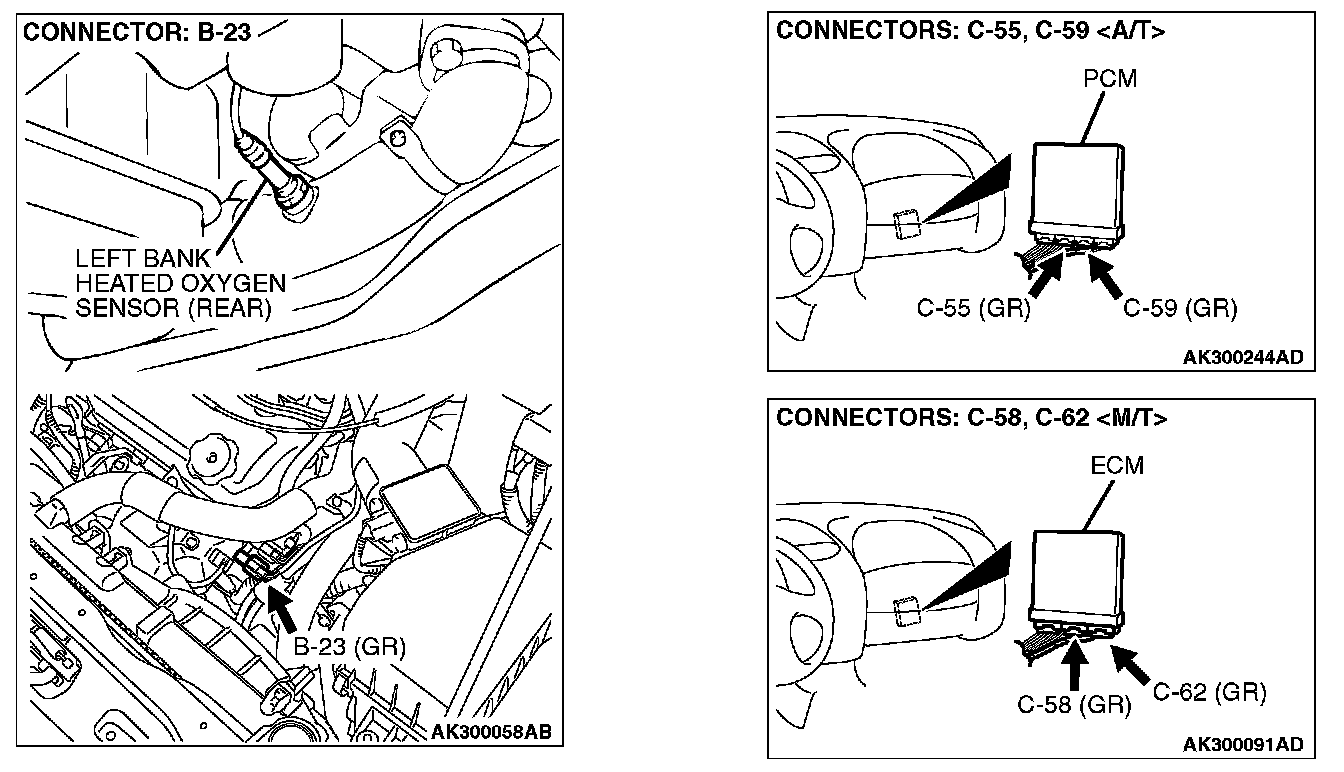 STEP 3. Check harness connector B-23 at left bank heated oxygen sensor (rear) and harness connector C-58, C-62 at ECM or C-55, C-59 at PCM for damage.