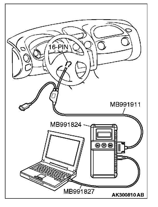 CAUTION: To prevent damage to scan tool MB991958, always turn the ignition switch to the "LOCK" (OFF) position before connecting or disconnecting scan tool MB991958.