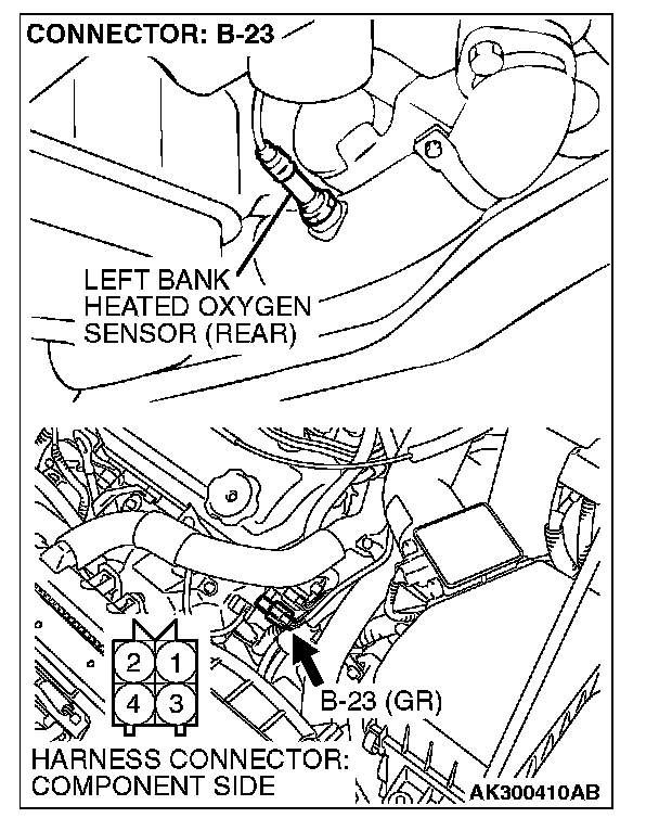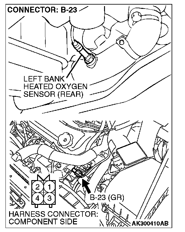 1. Disconnect the left bank heated oxygen sensor (rear) connector B-23 and connect test harness special tool, MB991316, to the connector on the left bank heated oxygen sensor (rear) side.