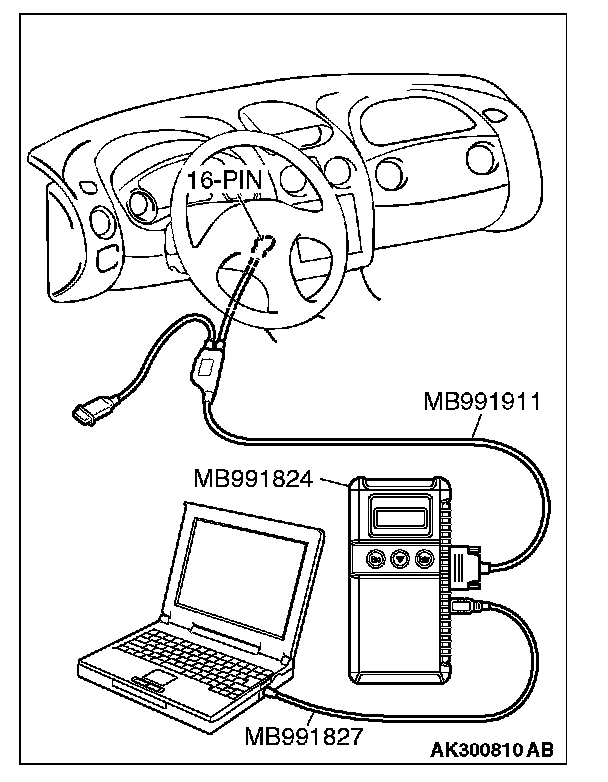 CAUTION: To prevent damage to scan tool MB991958, always turn the ignition switch to the "LOCK" (OFF) position before connecting or disconnecting scan tool MB991958.