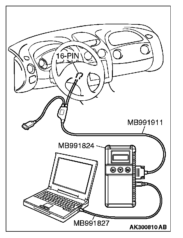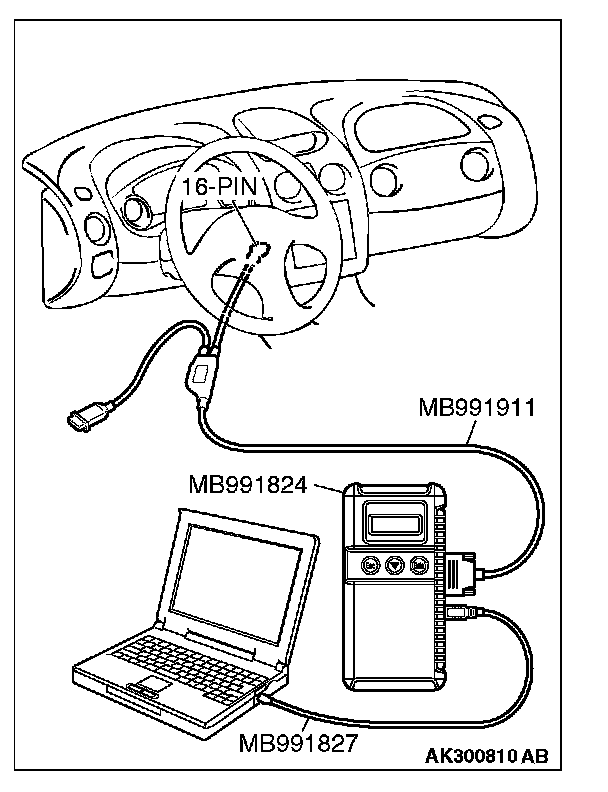 CAUTION: To prevent damage to scan tool MB991958, always turn the ignition switch to the "LOCK" (OFF) position before connecting or disconnecting scan tool MB991958.