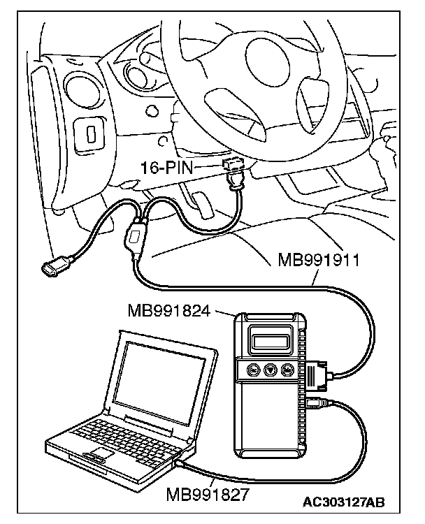 CAUTION: To prevent damage to scan tool MB991958, always turn the ignition switch to the "LOCK" (OFF) position before connecting or disconnecting scan tool MB991958.
