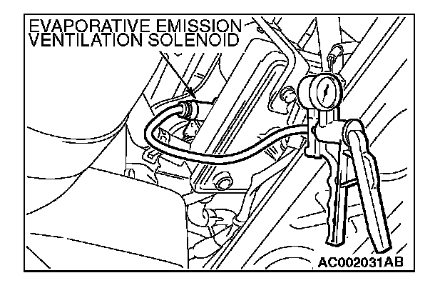 5. Set scan tool MB991958 to actuator test mode for item 29: Evaporative Emission Ventilation Solenoid. When the evaporative emission ventilation solenoid is operated, apply a pressure on the hand vacuum pump and confirm that air is maintained.
