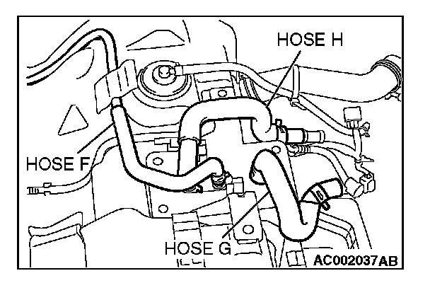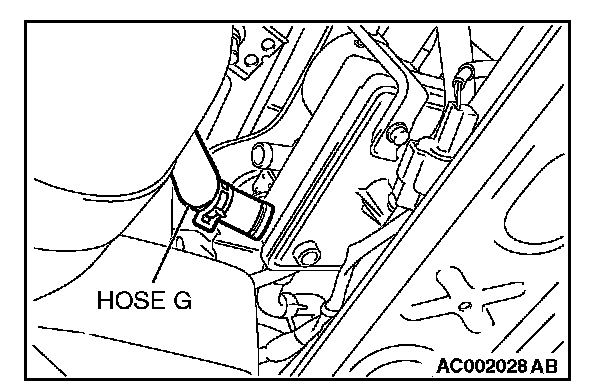 1. Remove the module bracket mounting bolts, and disconnect hose G from the evaporative emission ventilation solenoid side, and plug the hoses from which the hoses have been disconnected.