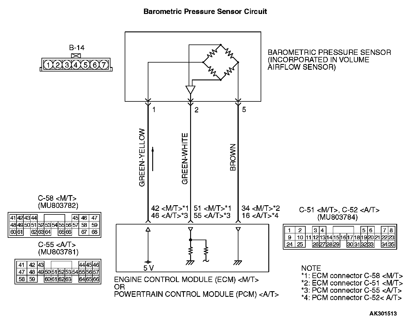 - A 5-volt voltage is supplied to the barometric pressure sensor power terminal (terminal No. 1) from the ECM (terminal No. 42)