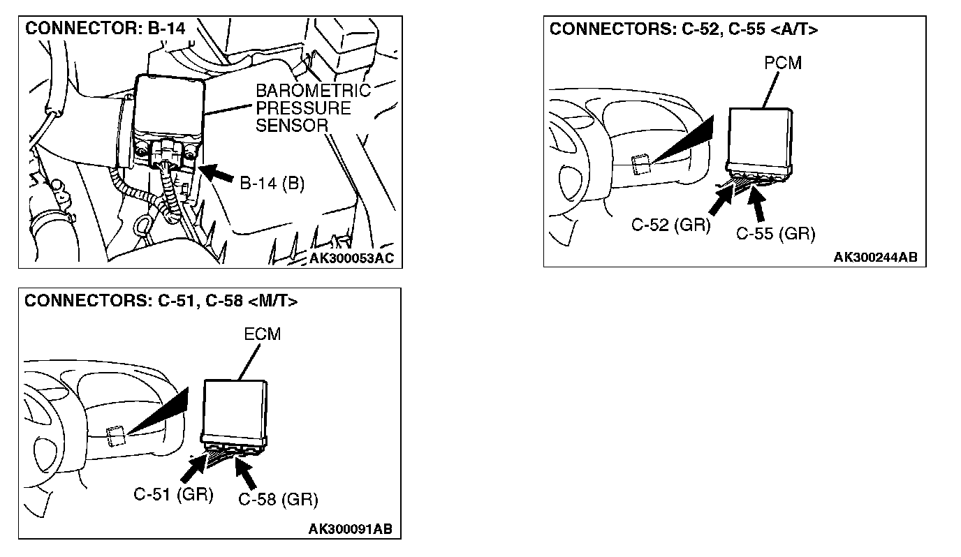 STEP 3. Check connector B-14 at the barometric pressure sensor and connector C-58 at ECM