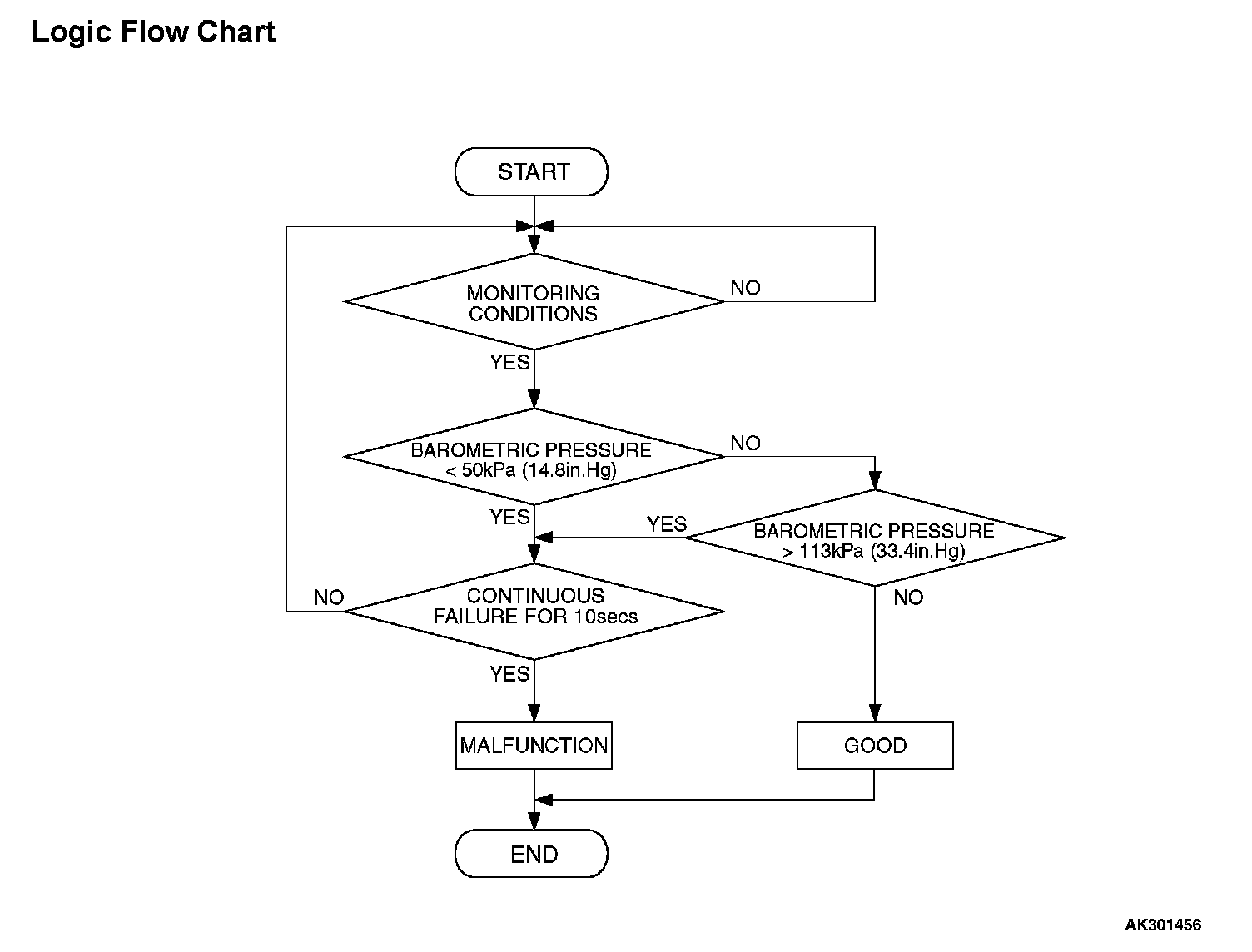 - Barometric pressure sensor output has continued to be 113 kPa (33.4 in.Hg) or higher approximately 4,000 ft below sea level for 10 seconds.