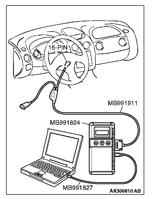 CAUTION: To prevent damage to scan tool MB991958, always turn the ignition switch to the "LOCK" (OFF) position before connecting or disconnecting scan tool MB991958.