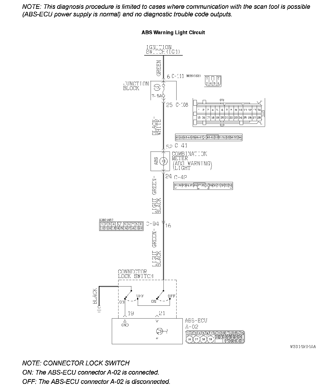 ^ When the ABS-ECU connector is disconnected, the circuit is grounded to illuminate the light by the connector lock switch OFF operation.