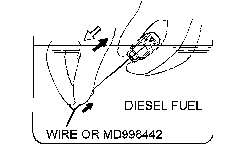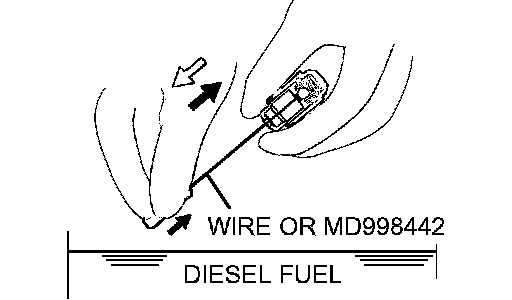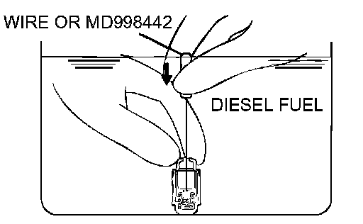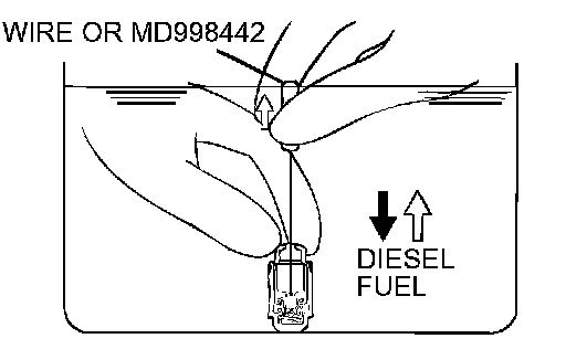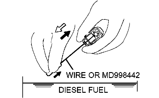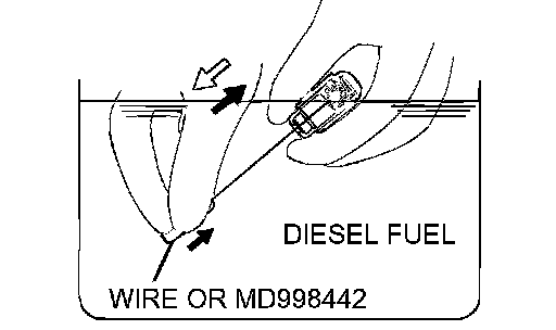 3. While gently pushing down the internal steel ball using wire [0.5 mm (0.020 inch) in diameter] or special tool MD998442, move the plunger through five to ten strokes until it slides smoothly. In addition to eliminating stiffness in the plunger, this operation will remove dirty oil.