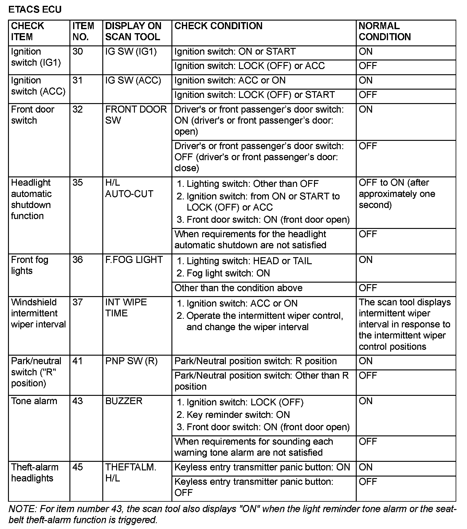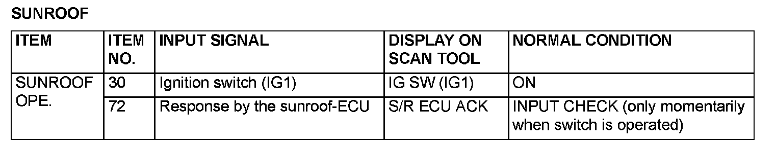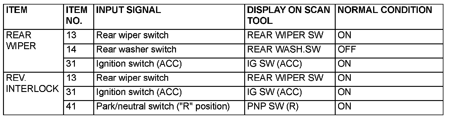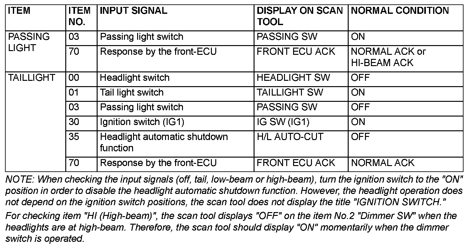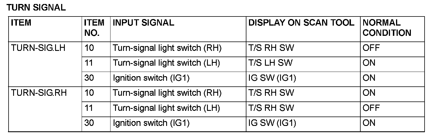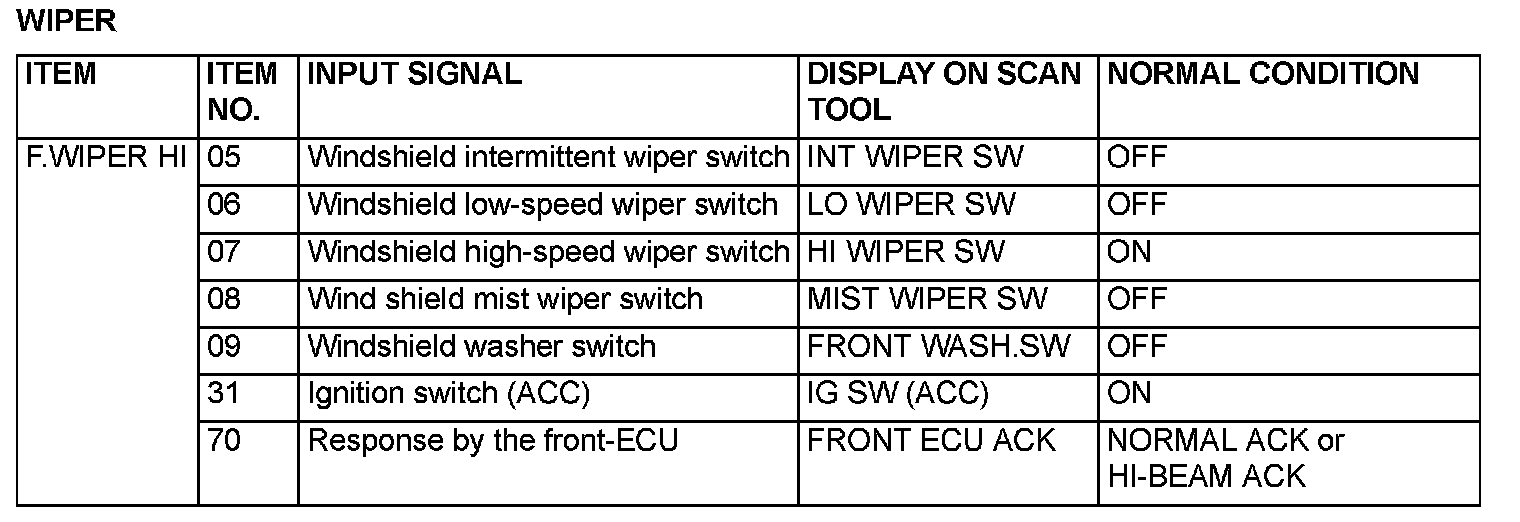 The table shows the service data and their normal condition, which are displayed during the "Data List."