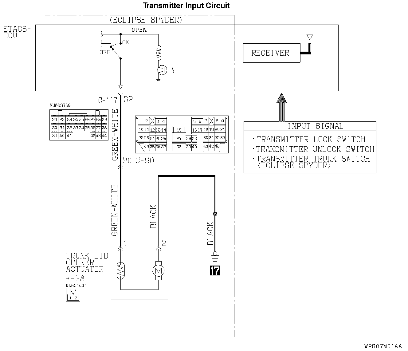 A receiver is incorporated in the ETACS-ECU. This receiver receives a lock, unlock or trunk open signal from the transmitter.