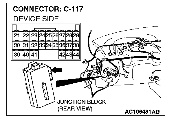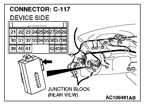 STEP 12. Check the trunk lid opener actuator connector F-38 and ETACS-ECU connector C-117 for damage.