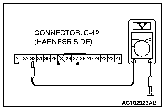 3. Install the bulb to the combination meter, and then measure the resistance value between connector C-42 terminals 31 and 32. The measured resistance value should be roughly the same as the value measured in Step (2).