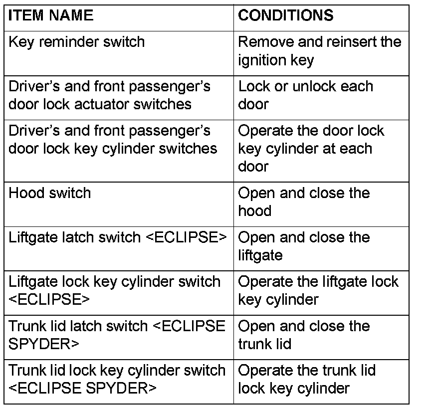 Q: When the key reminder switch, driver's and front passenger's door lock actuator switches, driver's and front passenger's door look key cylinder switches, hood switch, liftgate latch switch