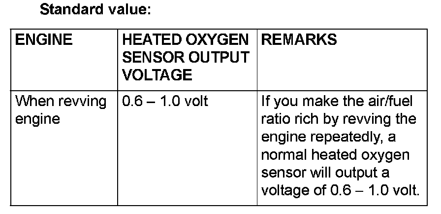 NOTE: If the sufficiently high temperature (of approximate 400 °C or more) is not reached although the oxygen sensor is normal, the output voltage would be possibly low although the rich air-fuel ratio. Therefore, if the output voltage is low, use a jumper wire to connect the terminal No.2 and the terminal No. 1 of the oxygen sensor with a (+) terminal and (-) terminal of 8 V power supply respectively, then check again.