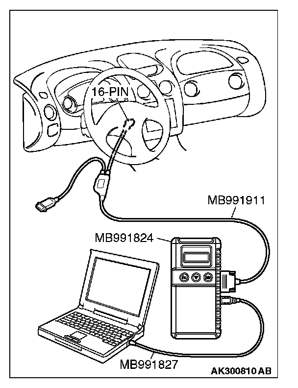 CAUTION: To prevent damage to scan tool MB991958, always turn the ignition switch to the "LOCK" (OFF) position before connecting or disconnecting scan tool MB991958.
