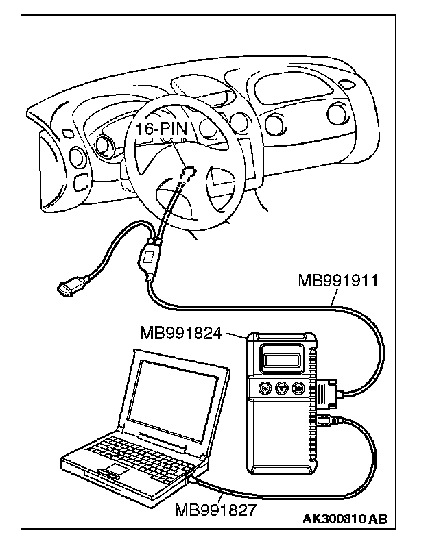 CAUTION: To prevent damage to scan tool MB991958, always turn the ignition switch to the "LOCK" (OFF) position before connecting or disconnecting scan tool MB991958.